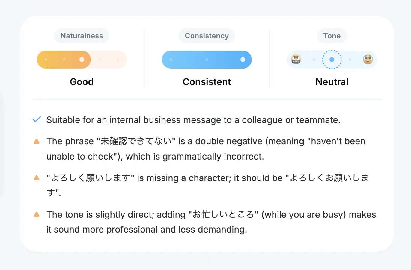 When you submit text, you'll first see a summary of the results. It tells you whether your text reads naturally and gives you a tone evaluation. You can quickly check: