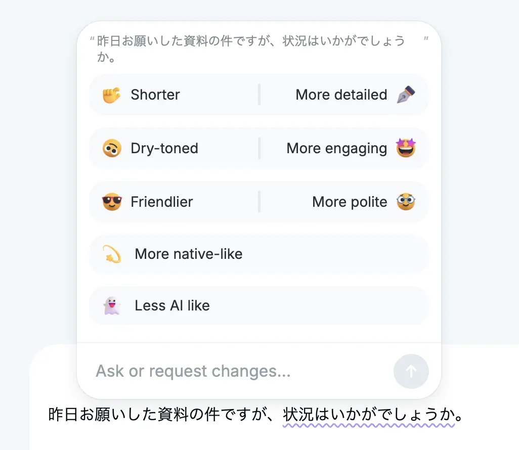 After getting suggestions, you can tweak the tone with quick buttons like "Friendlier" or "More polite."