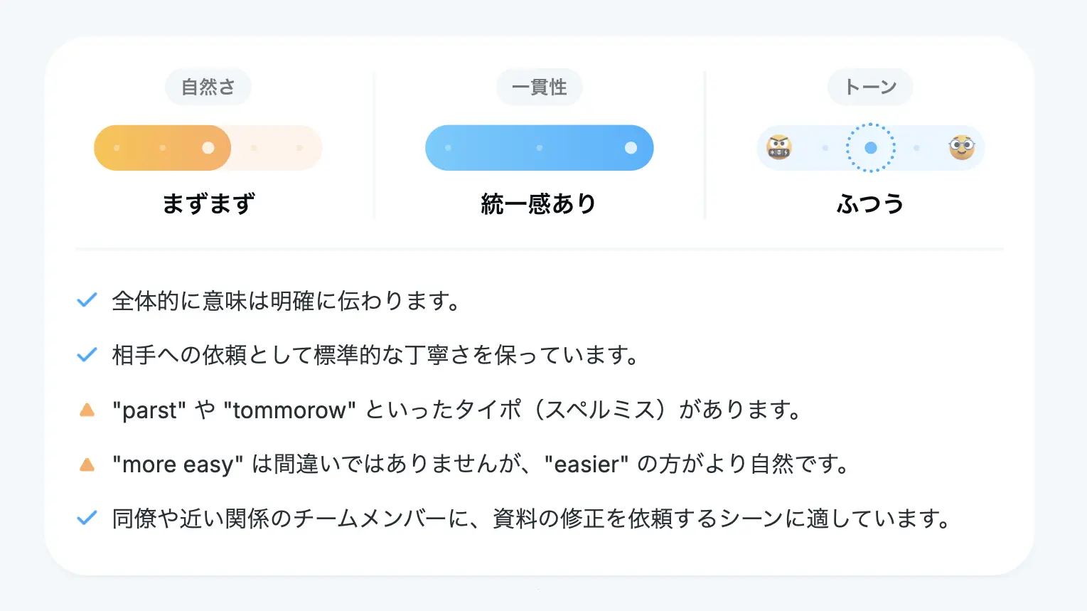 文章を送信するとまず添削結果の要約が表示されます。自然な文章になっているかに加えて、文章のトーンの評価も表示されます。この部分を見れば