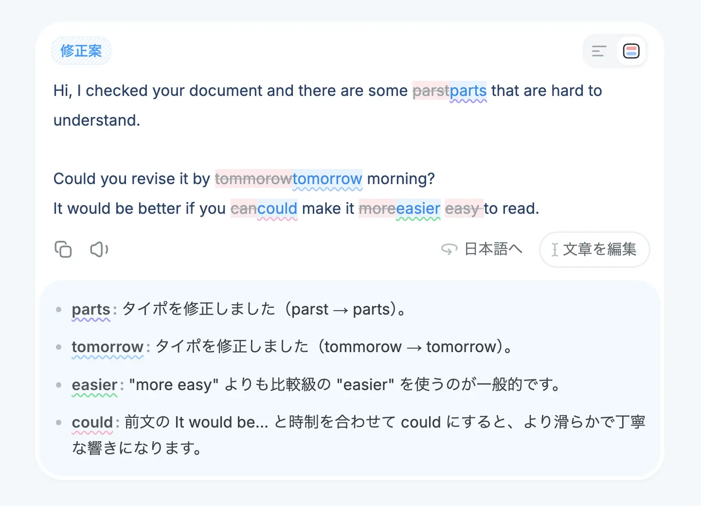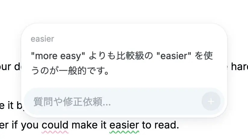 修正すべき点があれば修正案を、修正点がなくても別の表現例をよしなに提案してくれます。