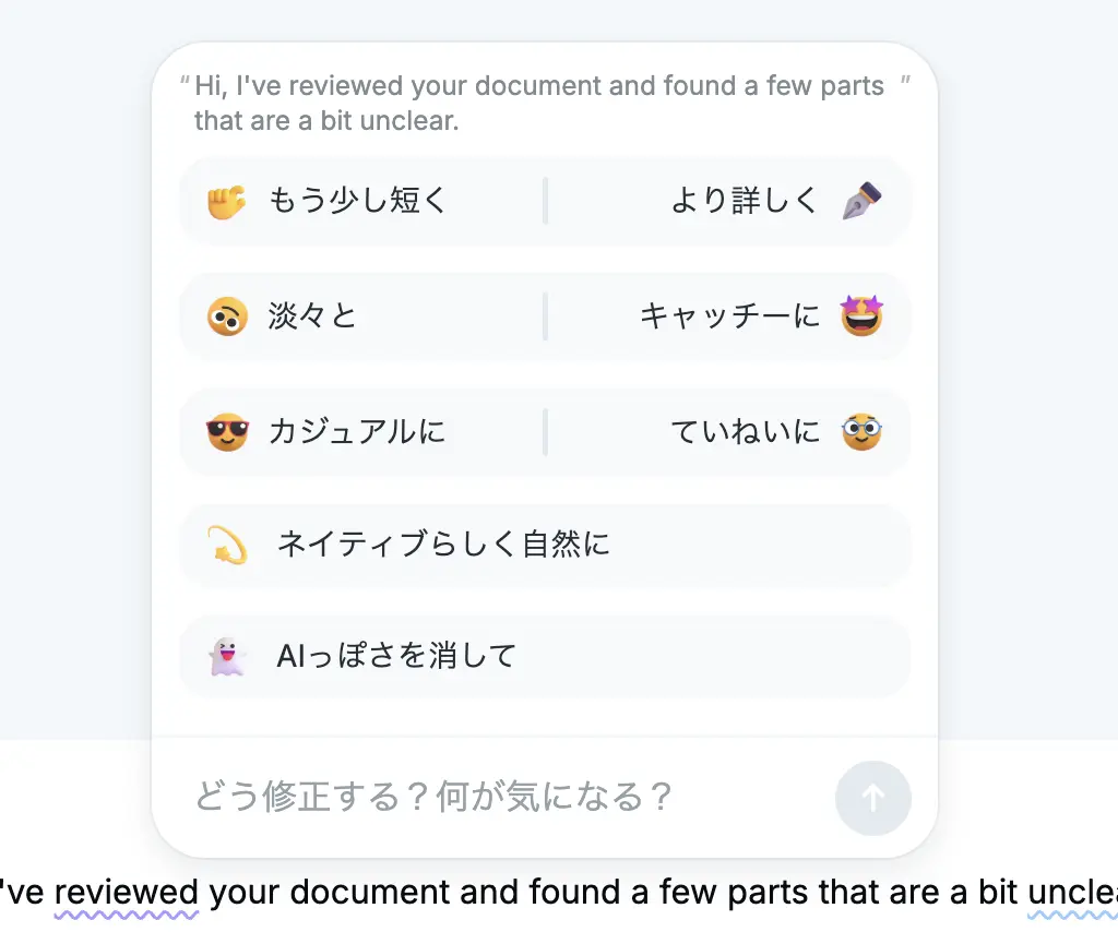 修正案に対しては「カジュアルに」「淡々と」などボタンをポチポチと押すだけで文体の調整ができます。
